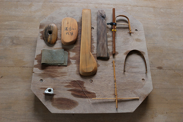 カンナ(帯鉄で作ったもの)、カキベラ(傘の骨で作ったもの)、ゼンマイの削り道具、筆などです。